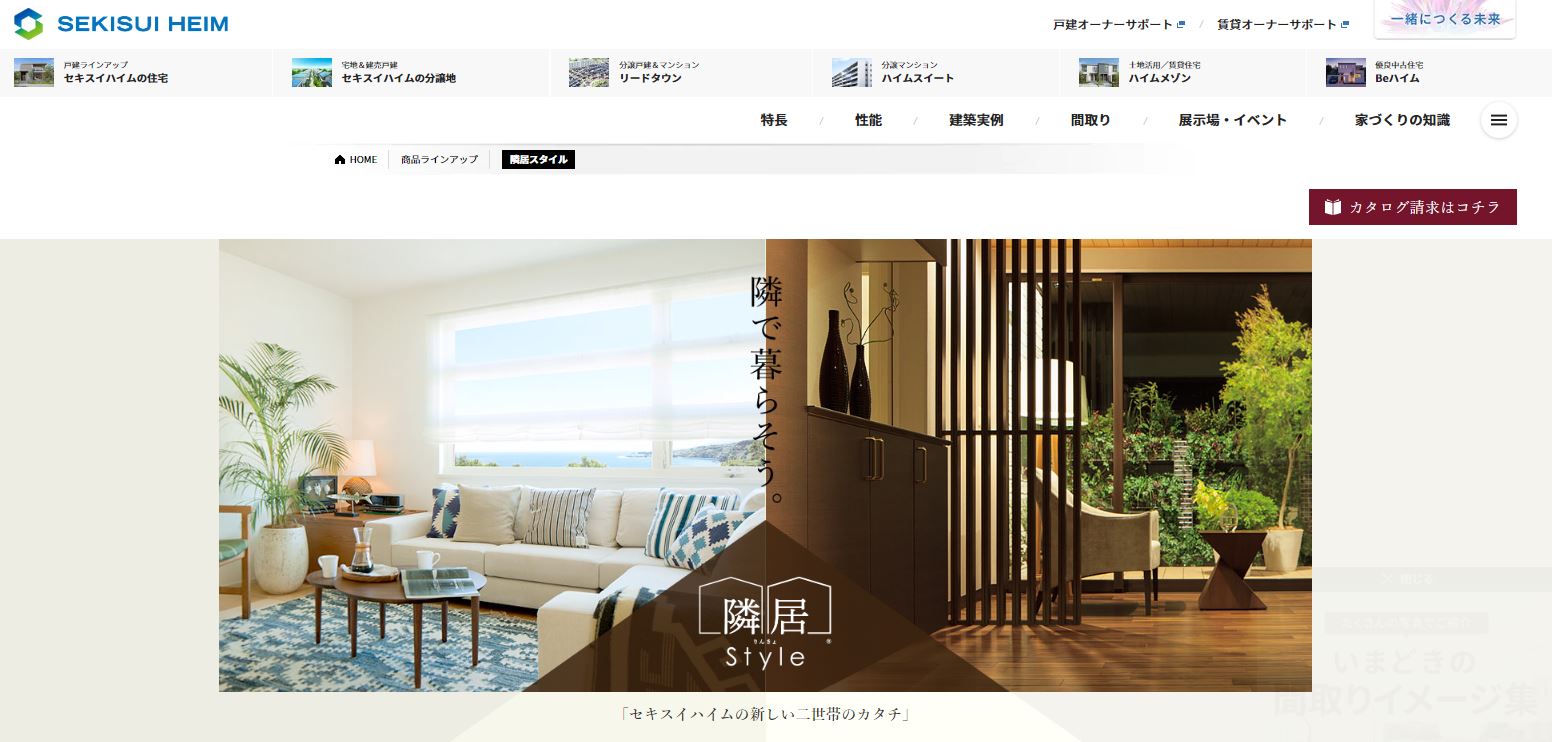 セキスイハイムが提供する二世帯住宅のおすすめ商品は「隣居Style」です。完全分離型の作りをしていながら、お互いの世帯から行ける「シェア空間」を設けることで、世帯ごとのプライバシーはしっかりと守りつつもコミュニケーションが取れる、ほどよい距離感を実現しています。